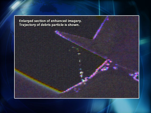Enlarged section of enhanced imagery. Trajectory of debris particle is shown.