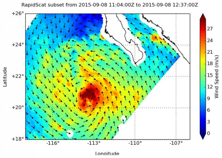 RapidScat data on September 8 at 7 a.m. EDT showed that the strongest sustained winds concentrated around the center of Linda’s tight circulation and were stronger than 30 meters per second (108 kph/67 mph). At that time, hurricane force winds extended outward up to 30 miles (45 km) from the center and tropical storm force winds extend outward up to 105 miles (165 km). The image was created by the RapidScat team at NASA’s Jet Propulsion Laboratory, Pasadena, California.