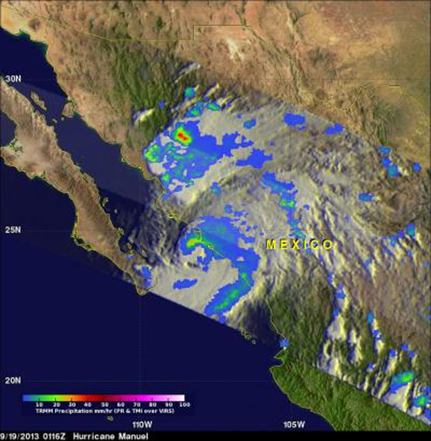 As predicted by the National Hurricane Center (NHC), tropical storm Manuel became a category one hurricane on Sept. 18. Manuel was an intensifying tropical storm that was located over the southern Gulf Of California with maximum wind speeds of about 50 knots/ 57.5 mph when the Tropical Rainfall Measuring Mission satellite called TRMM passed overhead on Sept. 18, 2013 at 1845 UTC/2:45 p.m. EDT. Manuel had intensified and was a minimal hurricane, hugging Mexico’s coast, with wind speeds of about 65 knots/75.8 mph when seen again by TRMM on Sept. 19 at 0116 UTC/Sept. 18 at 9:16 p.m. EDT.