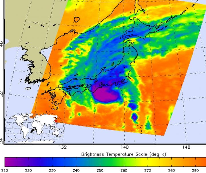 On Sept. 8 at 16:41 UTC (12:41 p.m. EDT), the AIRS or Atmospheric Infrared Sounder instrument aboard NASA’s Aqua satellite provided an infrared look at Etau land falling in east central Japan. The strongest storms with coldest cloud tops were over the Kansai and Hokkaido regions at the time Aqua flew overhead. AIRS measured cloud top temperatures near -63 Fahrenheit/-53 Celsius. NASA research indicates that storms with cloud top temperatures that cold, high in the troposphere, have the ability to generate heavy rainfall, as GPM indicated the previous day.