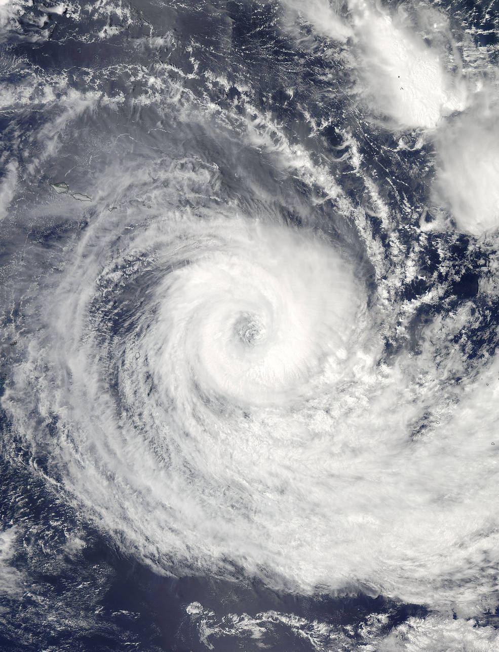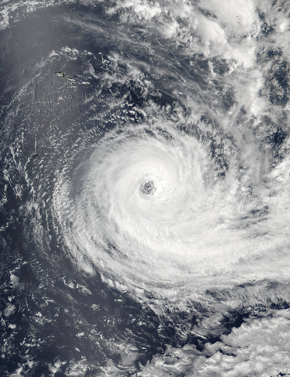 By Jan. 19 at 01:00 UTC when NASA-NOAA’s Suomi NPP satellite passed over Victor, the eye had moved southeast of the Cook Islands. The VIIRS instrument aboard Suomi NPP captured another visible image of the wide-eyed hurricane and observed that the eye was more open than it was during the time the Aqua satellite passed overhead. The eye was about 35 nautical miles (40 miles/64 km) wide. The Suomi image showed strong bands of thunderstorms wrapping into that ragged eye.