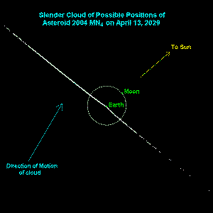 The cloud of possible positions of asteroid 2004 MN4 relative to
