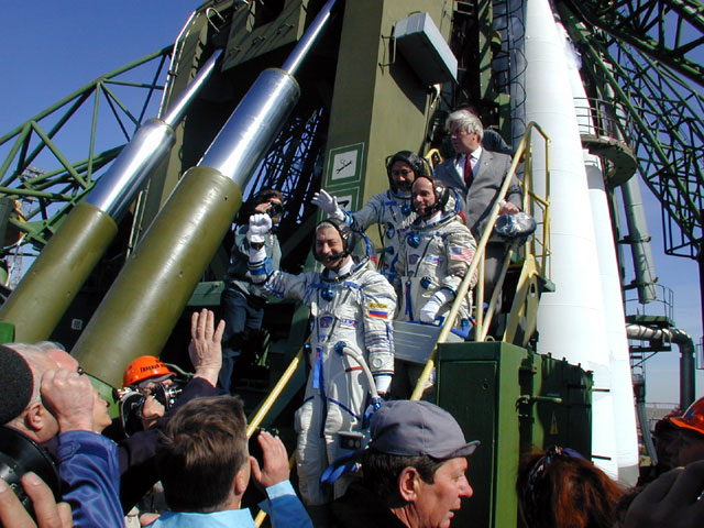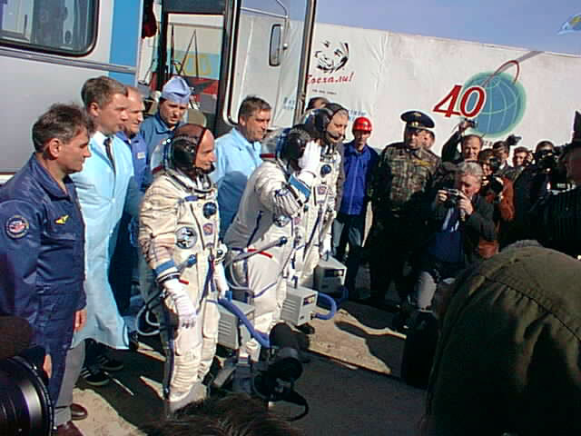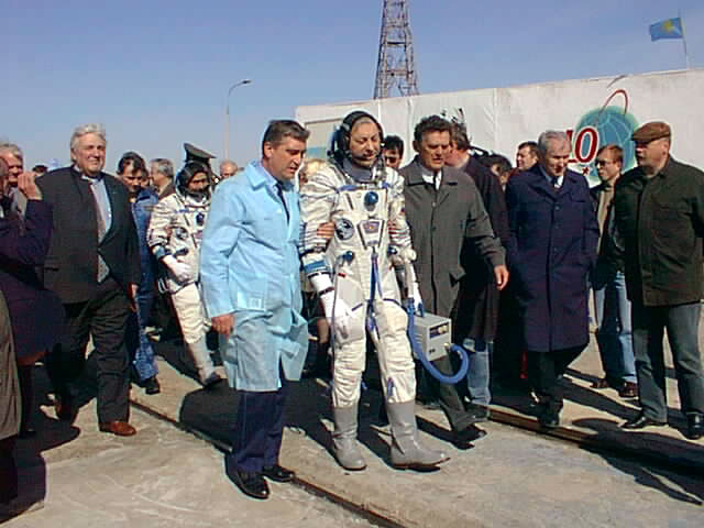 04/28/2001. Baikonur cosmodrome: Soyuz TM-32 crew at the launch pad prior to boarding their spacecraft.