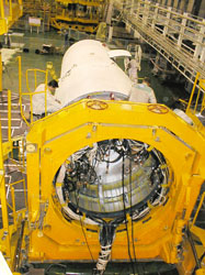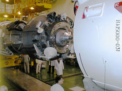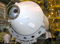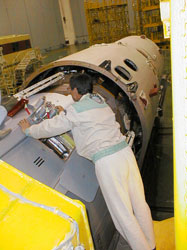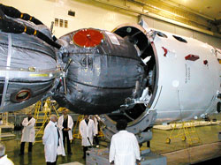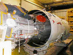 Photos of the Payload shroud roll on to the Soyuz TM space vehicle at Baikonur