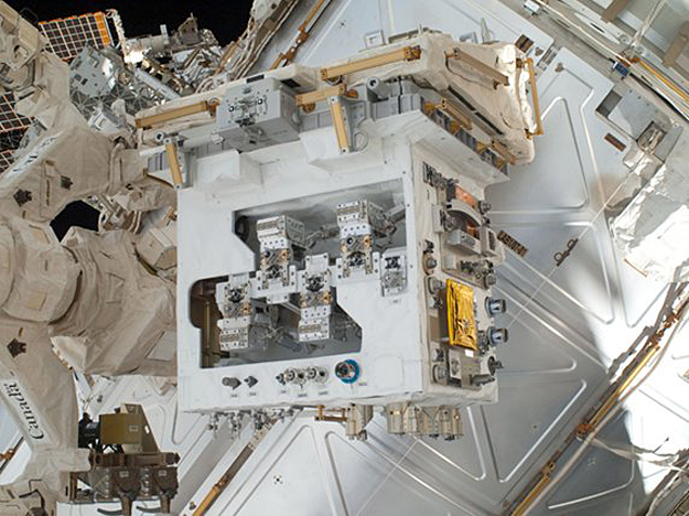 The Robotic Refueling Mission (RRM) module on the International Space Station before it was installed on its permanent platform. RRM will demonstrate robotic servicing technology and lay the foundation for future missions. (NASA)