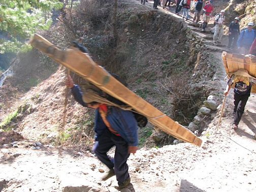 Porters performing an impressive display of strength: a porter carrying a massive amount of lumber to the market in Namche Bazar. This is not a trivial hike even with a light day pack!