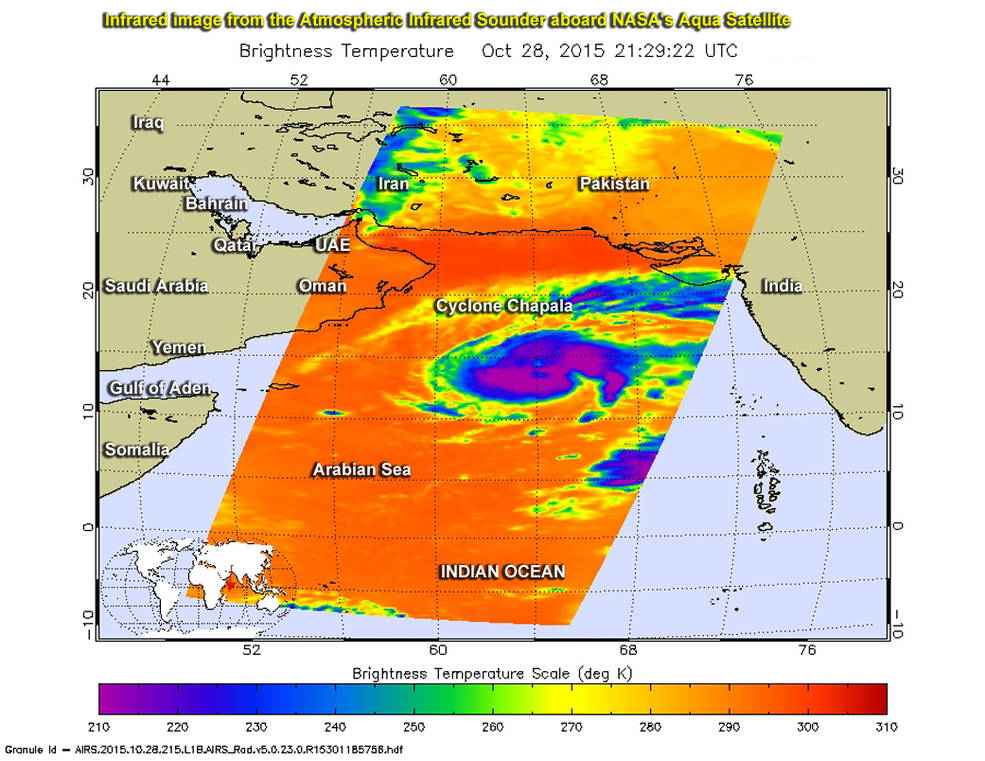 On Oct. 28 at 2129 UTC (5:29 p.m. EDT) infrared imagery from the Atmospheric Infrared Sounder or AIRS instrument that flies aboard NASA’s Aqua satellite looked at temperatures of Chapala’s clouds. AIRS data showed strong storms within Cyclone Chapala had cold cloud tops near minus 63 degrees Fahrenheit (minus 53 degrees Celsius) circling the center of a developing eye.
