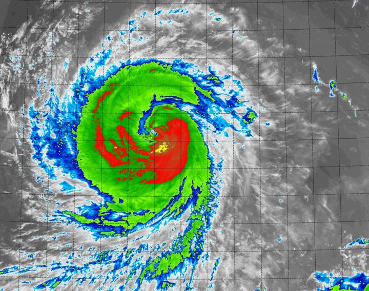 The Joint Typhoon Warning Center noted that animated enhanced infrared satellite imagery showed a slight warming of convective tops, which means that they weren’t reaching as high into the troposphere as a result of weakening uplift or push in the atmosphere. Otherwise, the system has maintained overall convective signature with tightly-curved banding wrapping into a 15-nautical mile diameter eye.